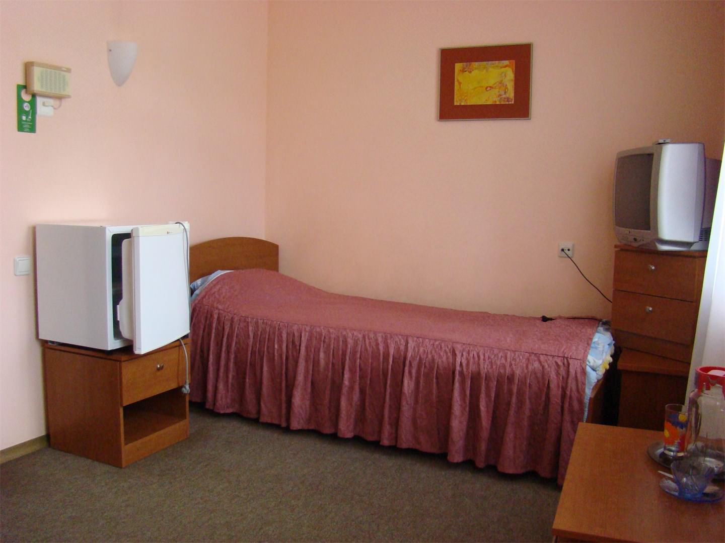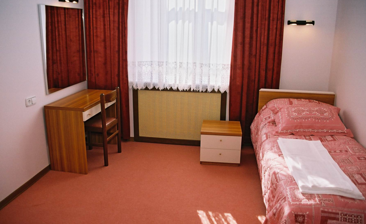 Площадь номера - 18 кв.м. 1 осн. место. Мебель: вешалка, кровать односпальная, прикроватная тумбочка, столик журнальный, шкаф. Оборудование: телевизор, холодильник, чайный набор посуды, электрочайник. Санузел на блок. Сервис: Wi-Fi бесплатно, смена полотенец, смена постельного белья, уборка номера.