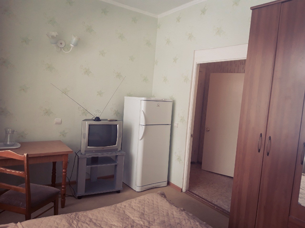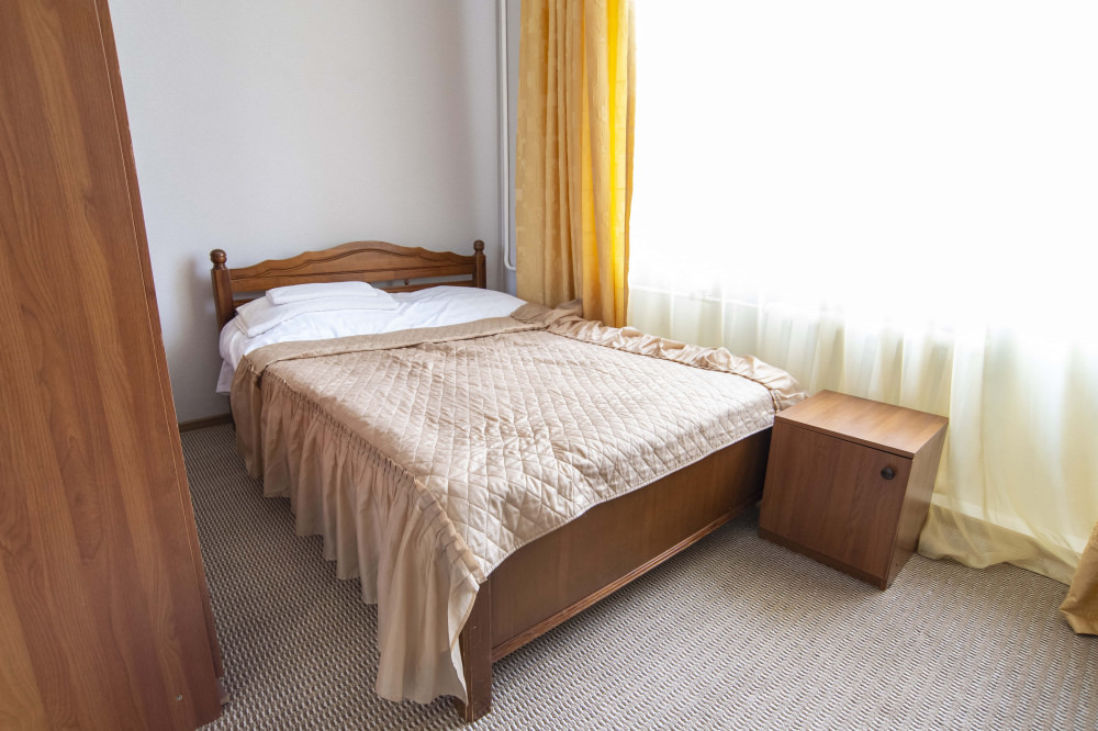 1 осн. место. Мебель: кровать двуспальная, прикроватные тумбочки, стол, стул, шкаф. Оборудование: телевизор, холодильник, чайный набор посуды, электрочайник. Санузел на блок. Сервис: Wi-Fi бесплатно, смена полотенец, смена постельного белья, уборка номера.