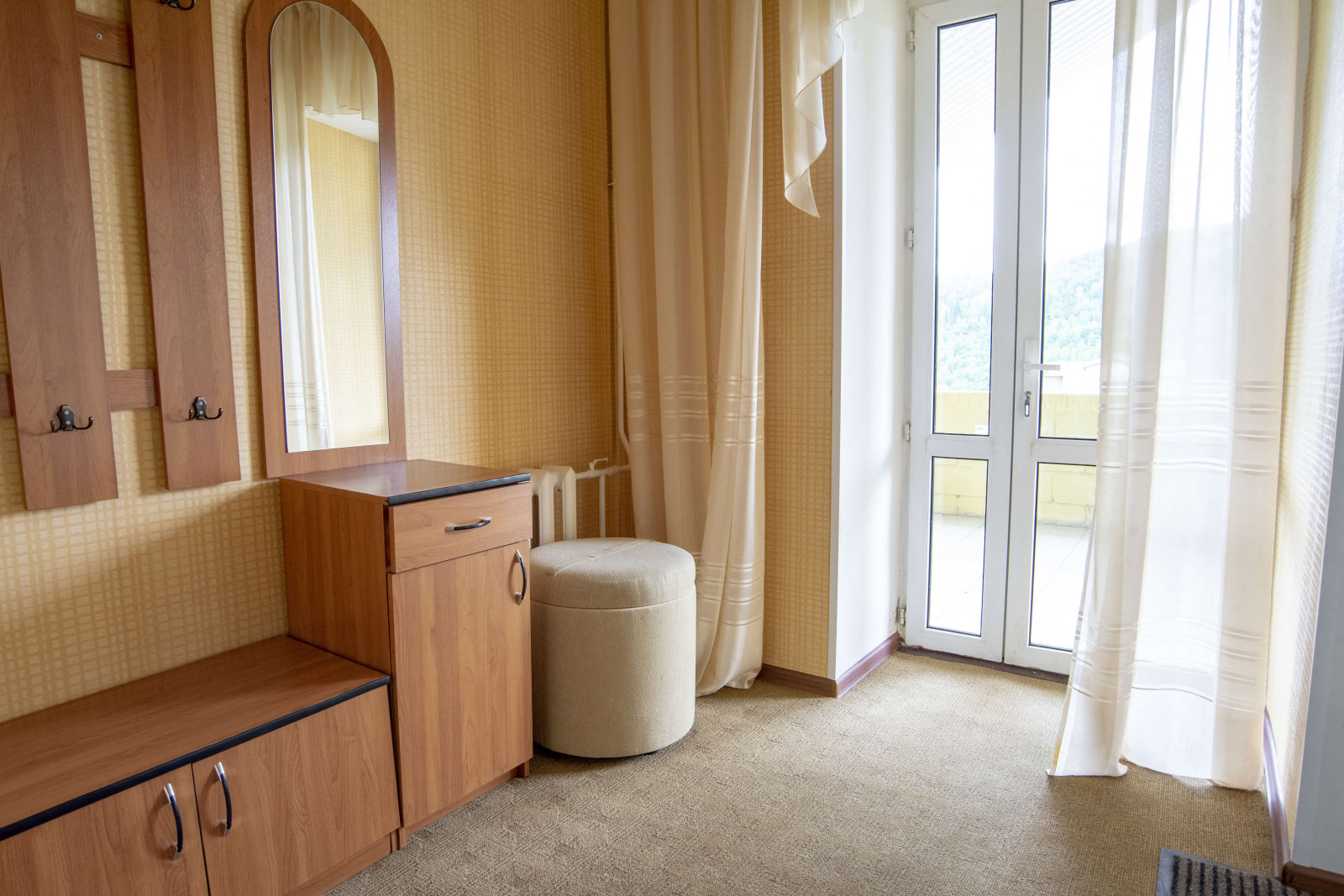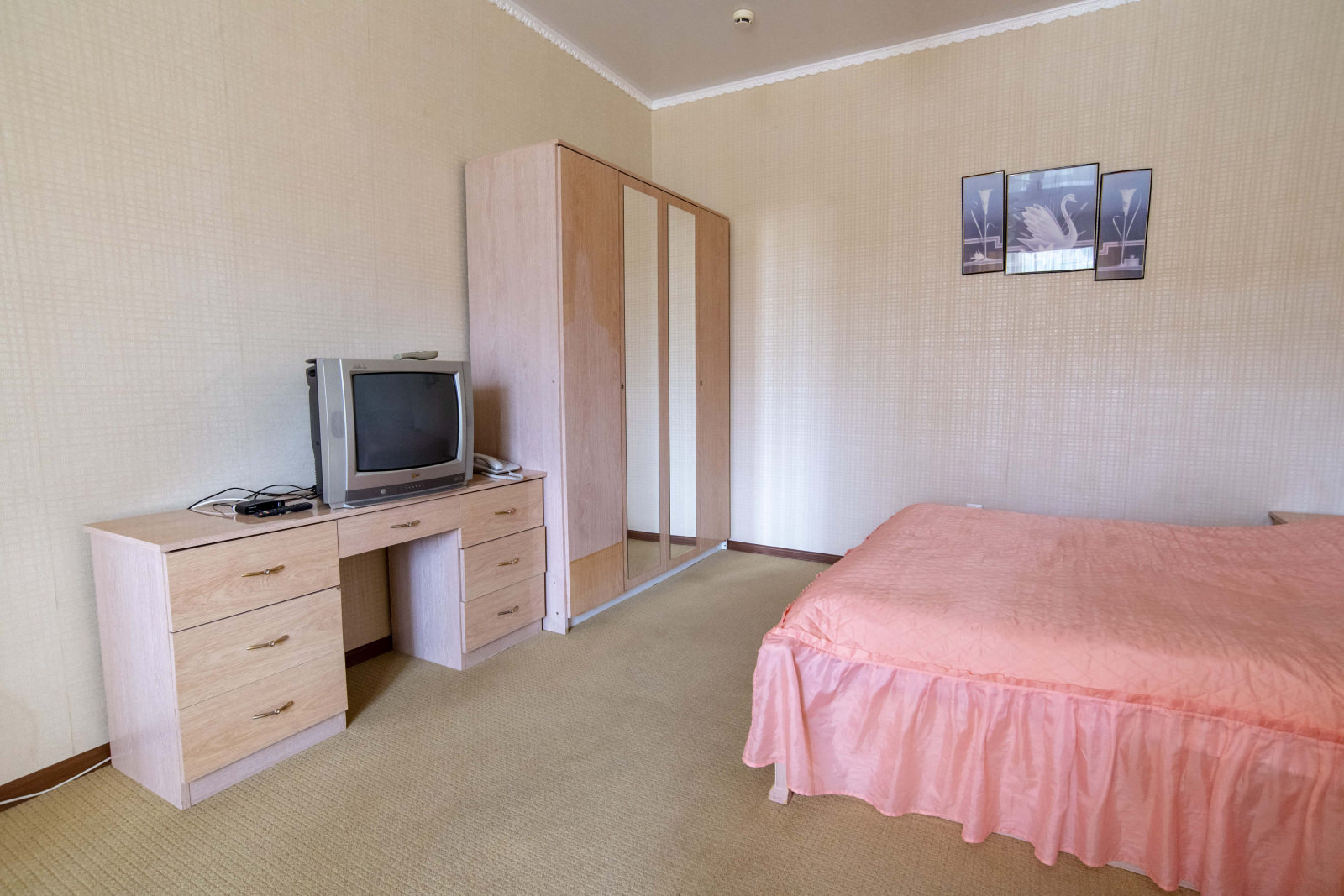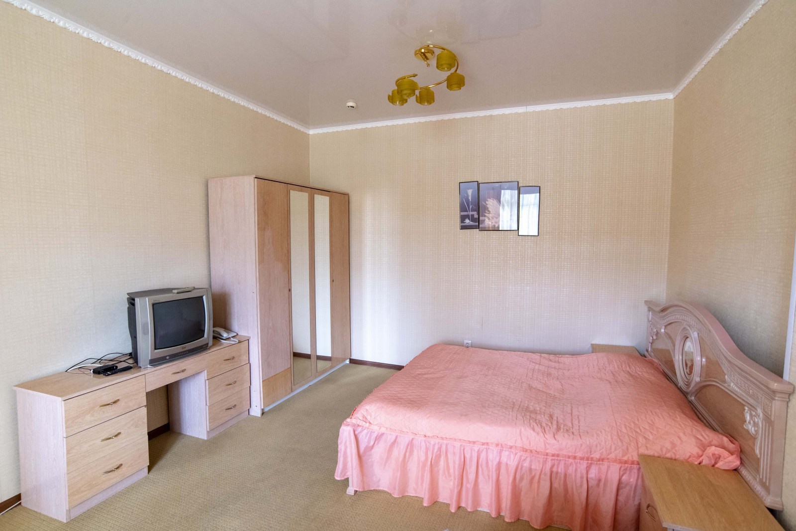 Площадь номера - 40 кв.м. 1 осн. место. 1 доп. место. Мебель: вешалка, кровать двуспальная, прикроватные тумбочки, стол, стул, шкаф. Оборудование: телевизор, холодильник, чайный набор посуды, электрочайник. Санузел. Сервис: Wi-Fi бесплатно, смена полотенец, смена постельного белья, уборка номера.