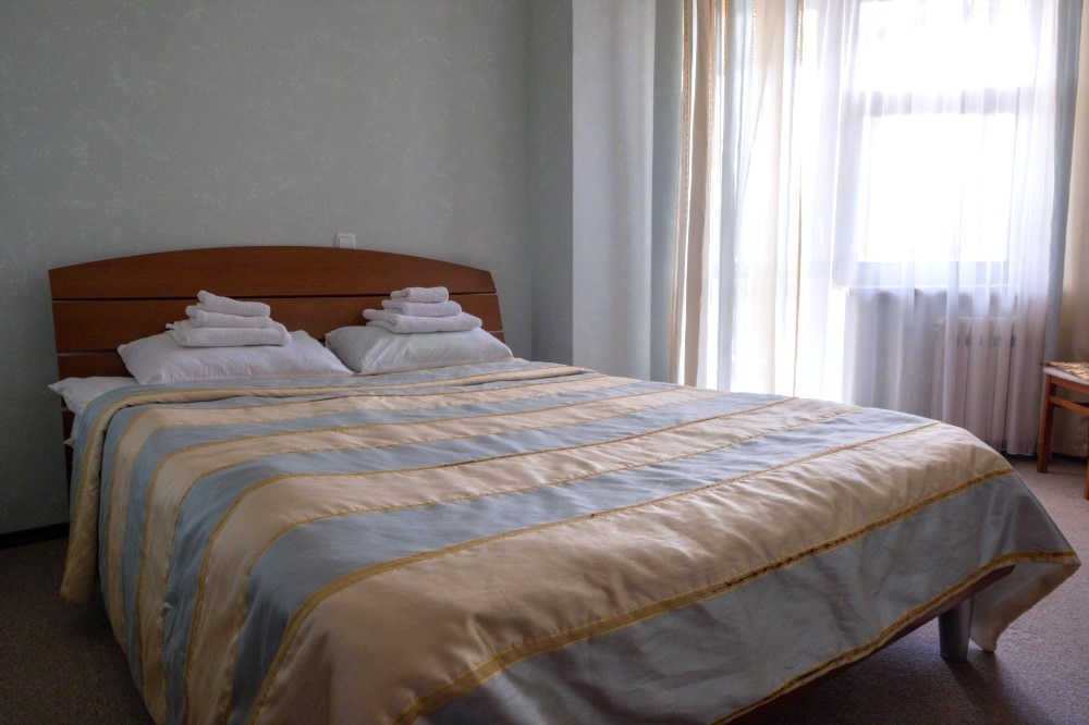 1 осн. место. 3 доп. места. Мебель: вешалка, диван раскладной, зеркало, кровать двуспальная, прикроватные тумбочки, столик журнальный, шкаф. Оборудование: телевизор, холодильник, чайный набор посуды, электрочайник. Санузел. Санузел и душевые на территории. Сервис: Wi-Fi бесплатно, смена полотенец, смена постельного белья, уборка номера.