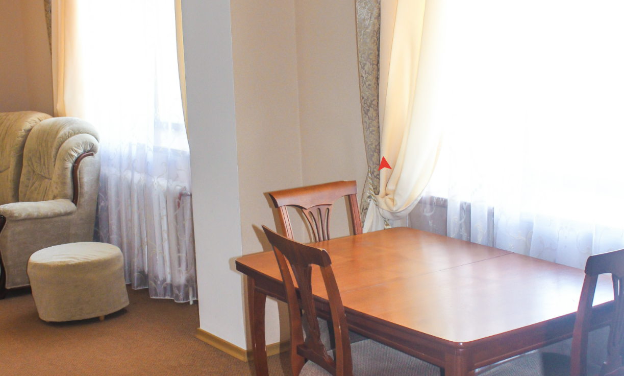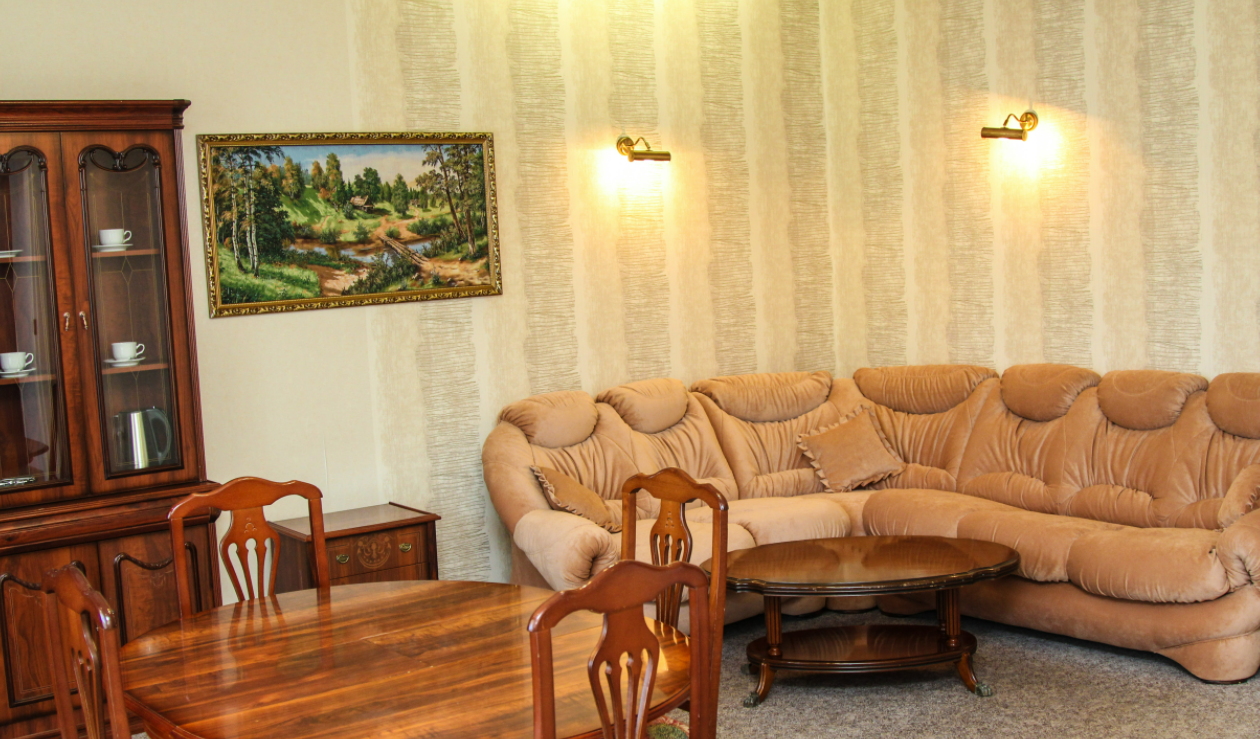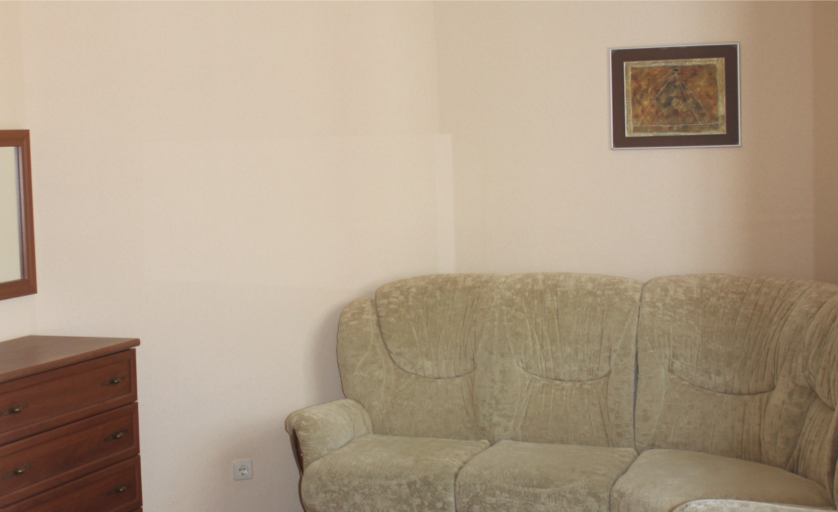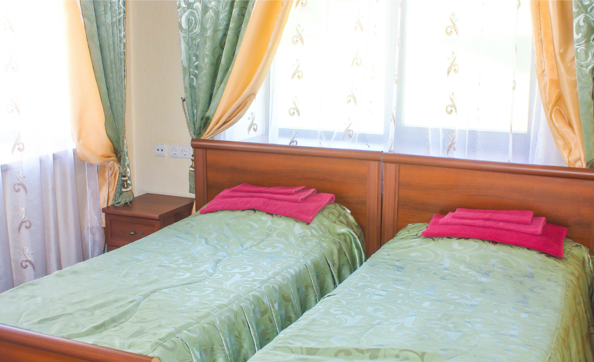2 осн. места. 2 доп. места. Мебель: вешалка, диван раскладной, зеркало, комод, кровати односпальные, прикроватные тумбочки, стол, столик журнальный, стулья, тумба под телевизор, шкаф, шкаф для посуды. Оборудование: телевизор, холодильник, чайный набор посуды, электрочайник. Санузел. Сервис: Wi-Fi бесплатно, смена полотенец, смена постельного белья, уборка номера.