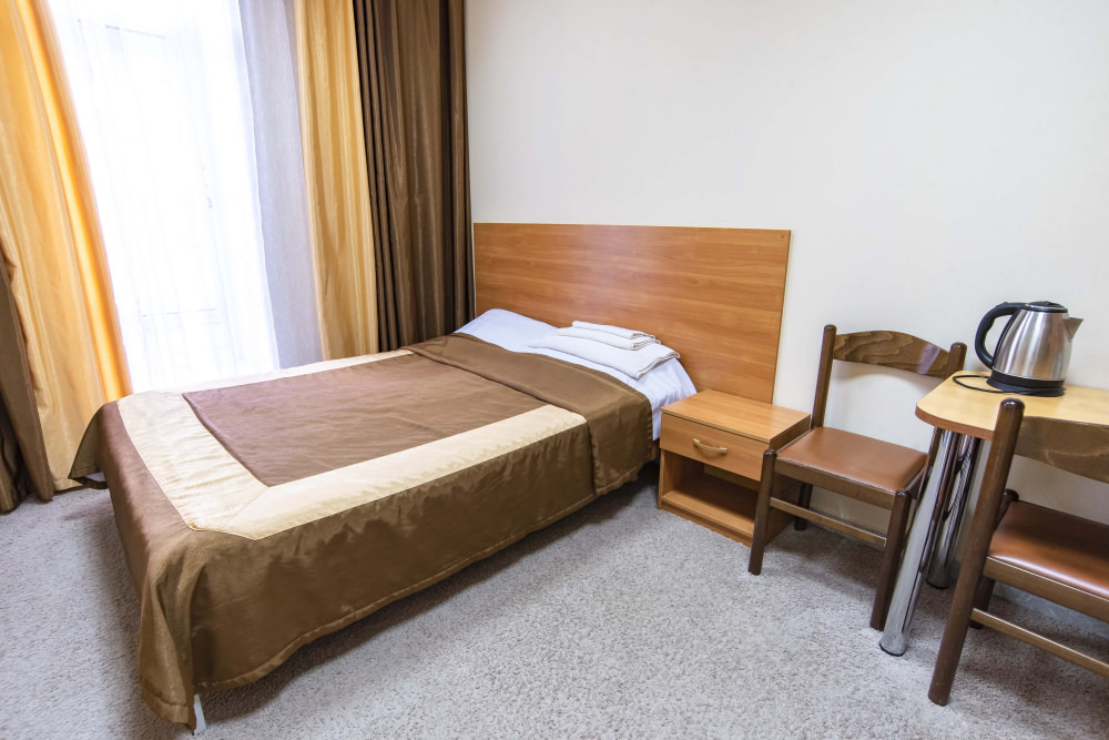 Площадь номера - 30 кв.м. 1 осн. место. 2 доп. места. Мебель: кресла, кровать двуспальная, прикроватные тумбочки, столик журнальный, столик туалетный, стул, тумба багажная, шкаф. Оборудование: телевизор, холодильник, чайный набор посуды, электрочайник. Санузел. Сервис: Wi-Fi бесплатно, смена полотенец, смена постельного белья, уборка номера.