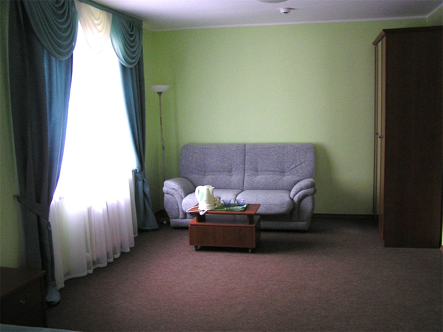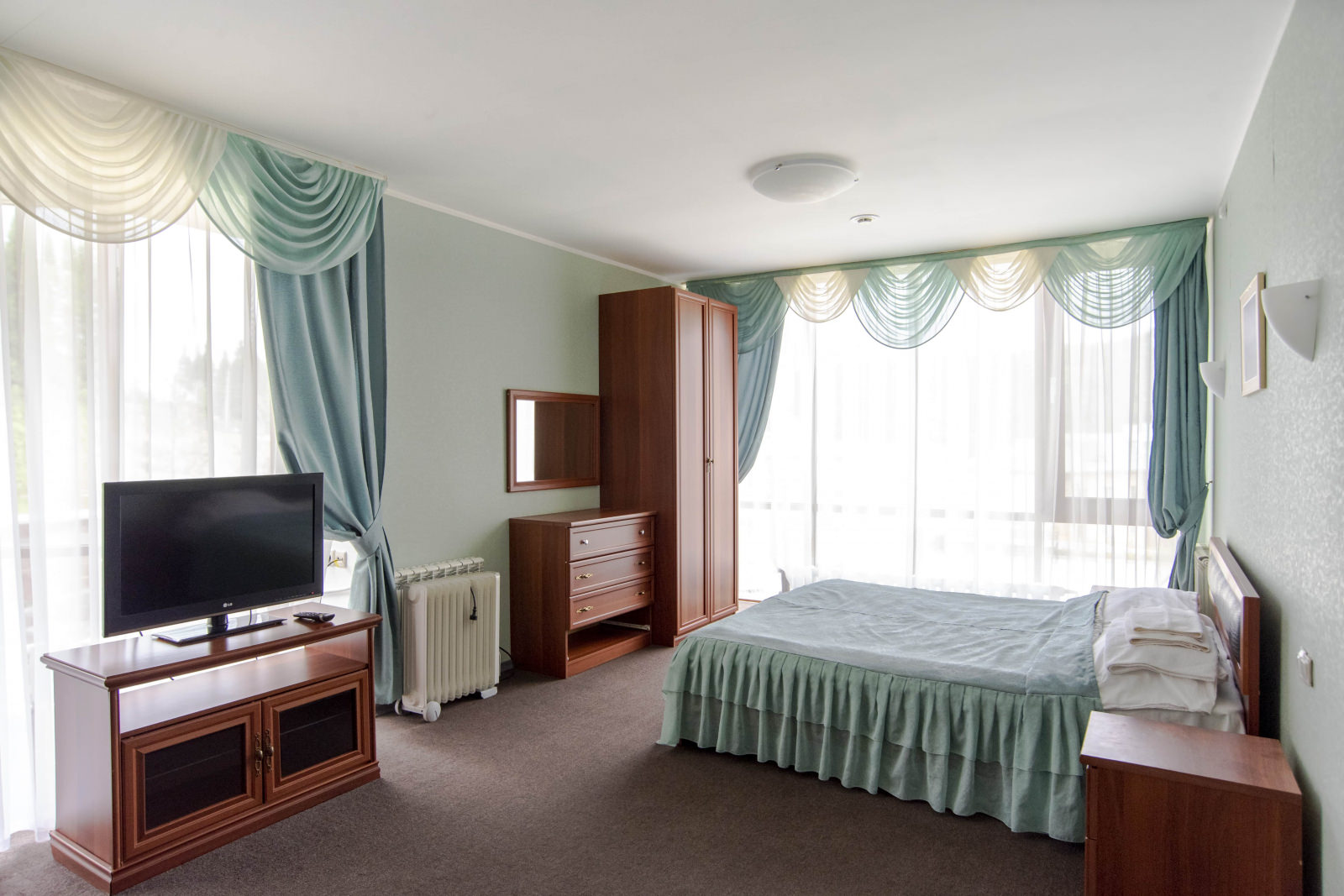Площадь номера - 30 кв.м. 1 осн. место. 2 доп. места. Мебель: вешалка, диван раскладной, кровать двуспальная, прикроватные тумбочки, стол, стулья, шкаф. Оборудование: телевизор, холодильник, чайный набор посуды, электрочайник. Санузел. Сервис: Wi-Fi бесплатно, смена полотенец, смена постельного белья, уборка номера.