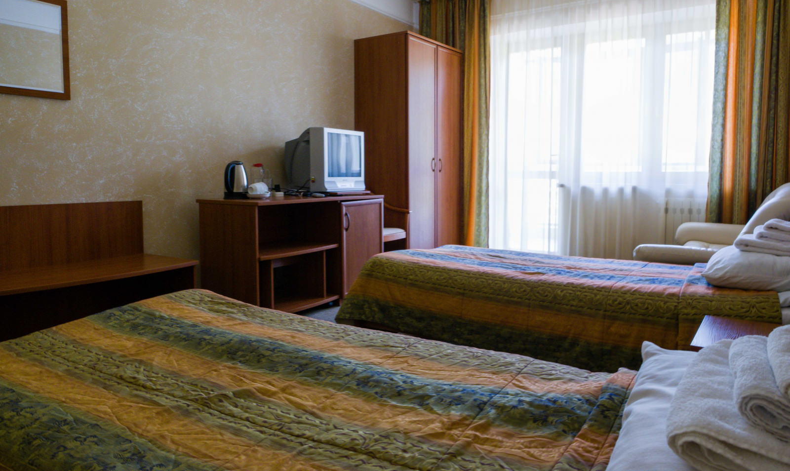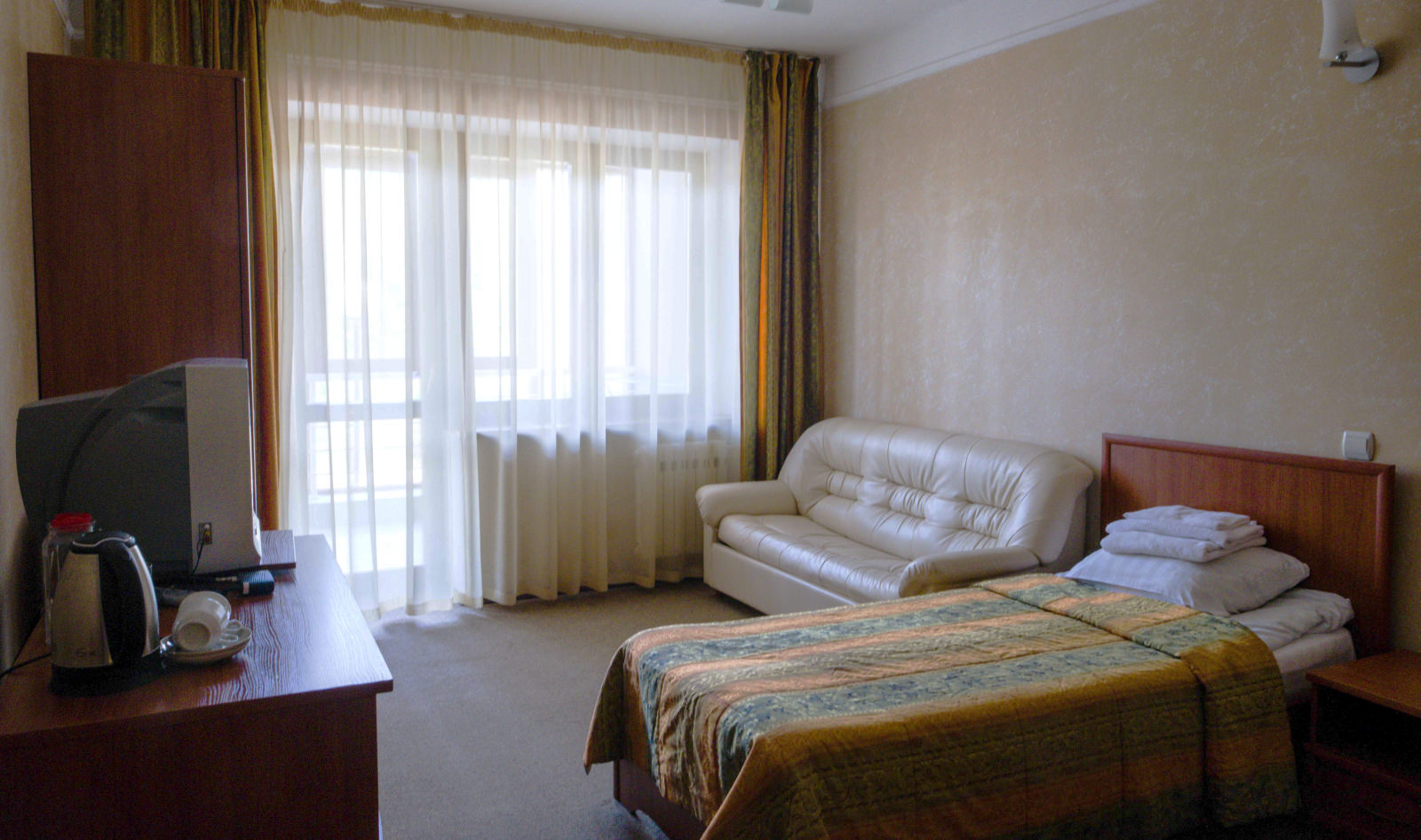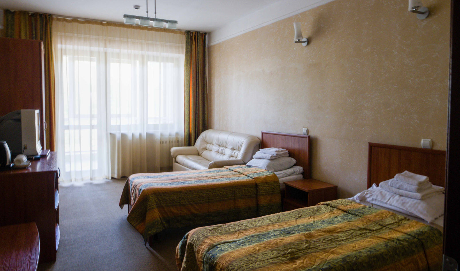 Площадь номера - 30 кв.м. 2 осн. места. 1 доп. место. Балкон. Мебель: вешалка, кровати полутороспальные, столик журнальный, стулья, шкаф. Оборудование: телевизор, холодильник, чайный набор посуды, электрочайник. Санузел. Сервис: Wi-Fi бесплатно, смена полотенец, смена постельного белья, уборка номера.