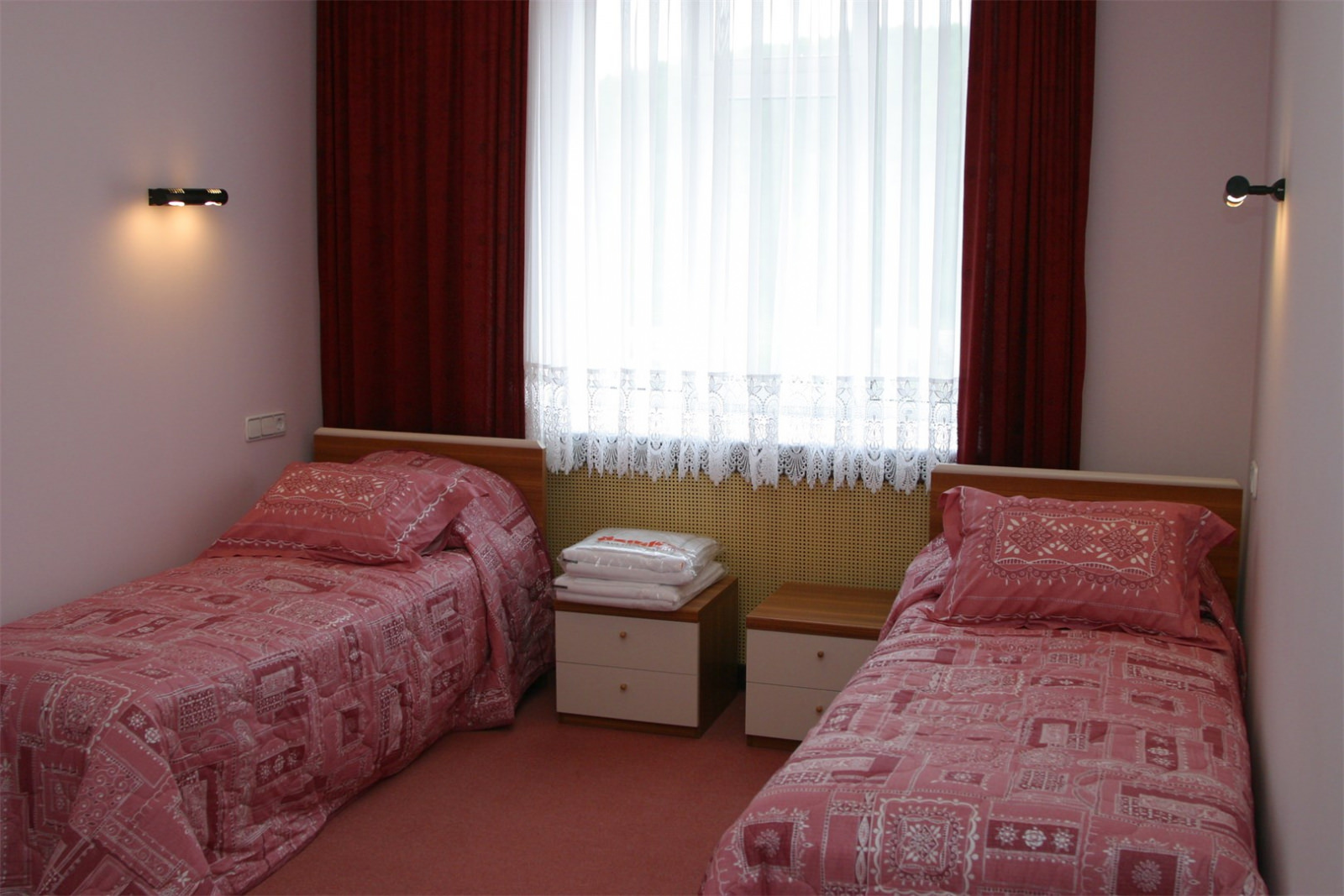 Площадь номера - 30 кв.м. 2 осн. места. 2 доп. места. Мебель: кресла, кровати односпальные, прикроватные тумбочки, столик журнальный, шкаф. Оборудование: телевизор, холодильник, чайный набор посуды, электрочайник. Санузел. Сервис: Wi-Fi бесплатно, смена полотенец, смена постельного белья, уборка номера.